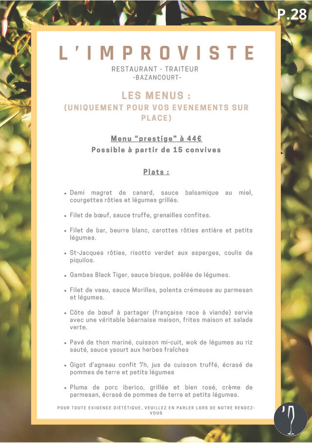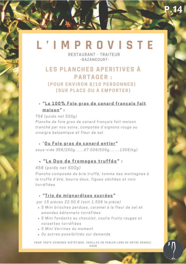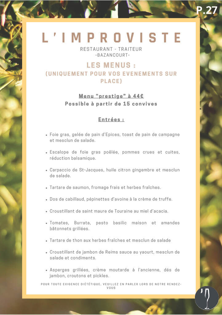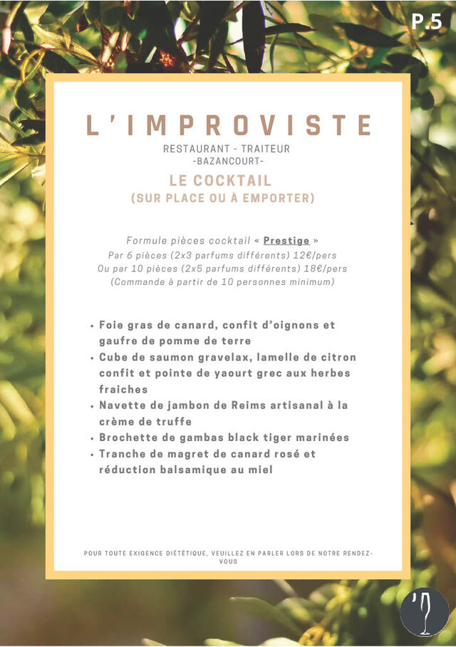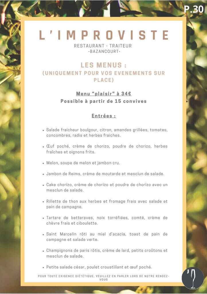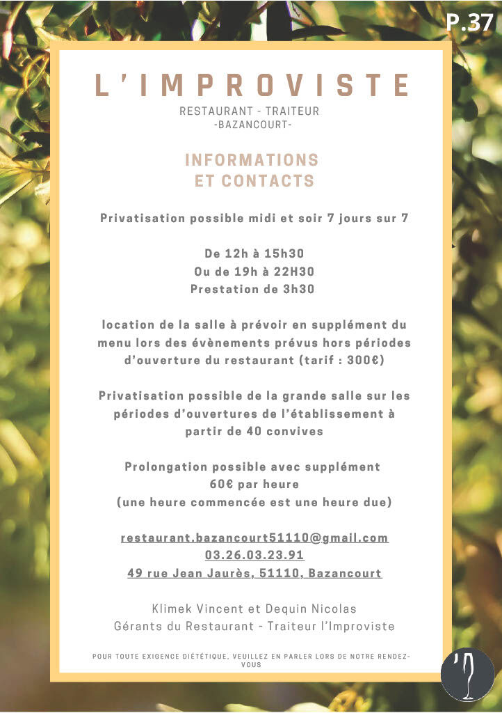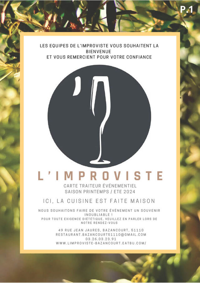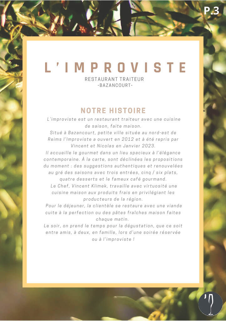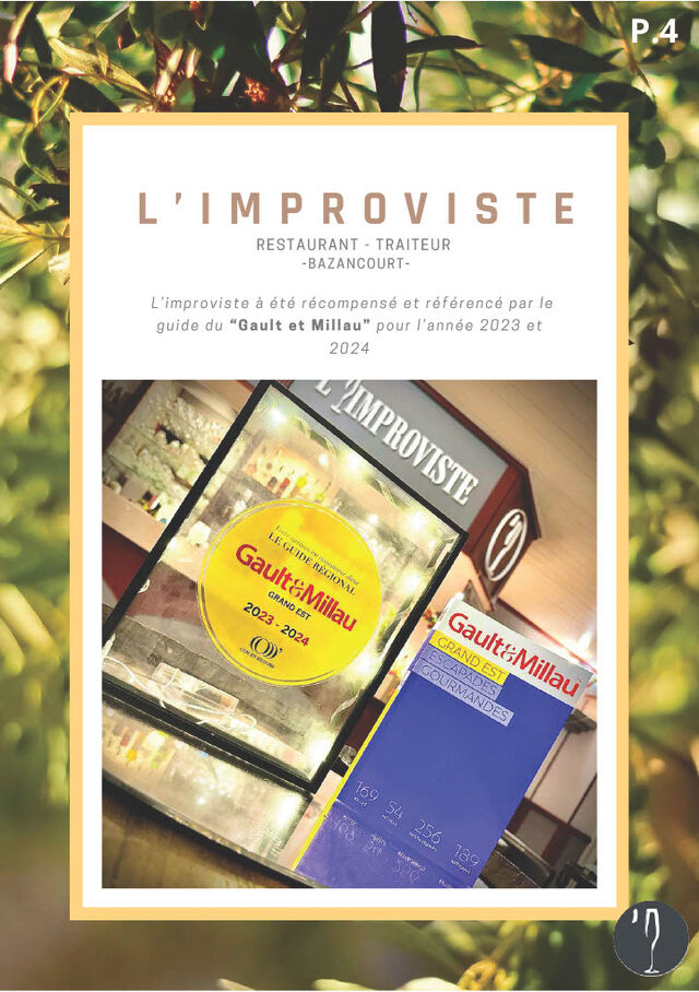 À Bazancourt, petite ville située au nord-est de Reims, l’Improviste accueille le gourmet dans un lieu spacieux à l’élégance contemporaine. À l’ardoise, la carte décline les propositions de la semaine : des suggestions authentiques et renouvelées au gré des saisons avec trois entrées, cinq plats, trois desserts et le fameux café gourmand. Le Chef, Vincent Klimek, travaille avec virtuosité une cuisine maison aux produits frais en privilégiant les producteurs de la région. Pour le déjeuner, la clientèle se restaure avec une viande cuite à la perfection ou des pâtes fraîches maison à la crème d’asperges blanches. Le soir, on prend le temps pour la dégustation que ce soit entre amis, à deux, en famille, lors d’une soirée réservée ou à l’improviste !