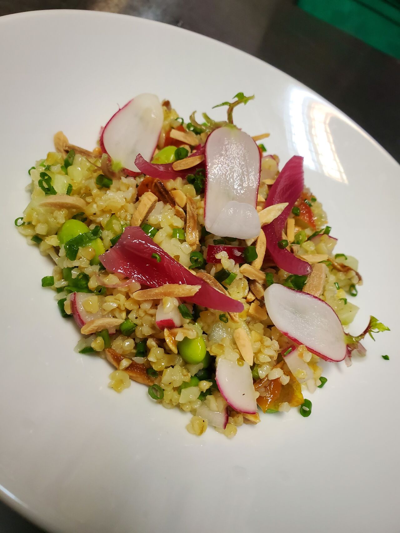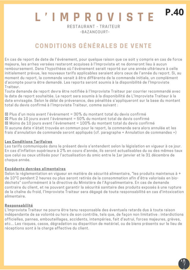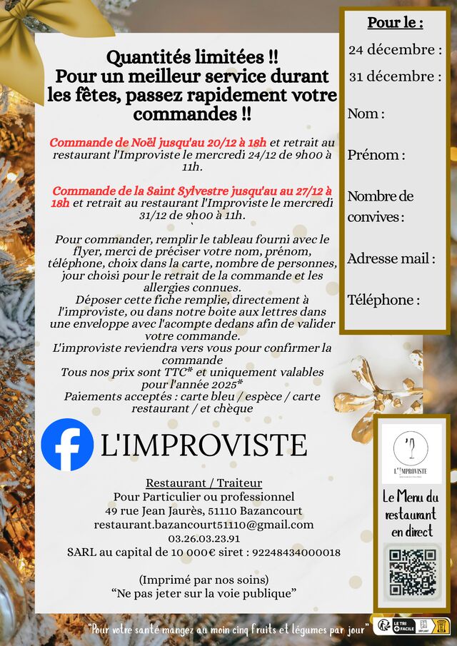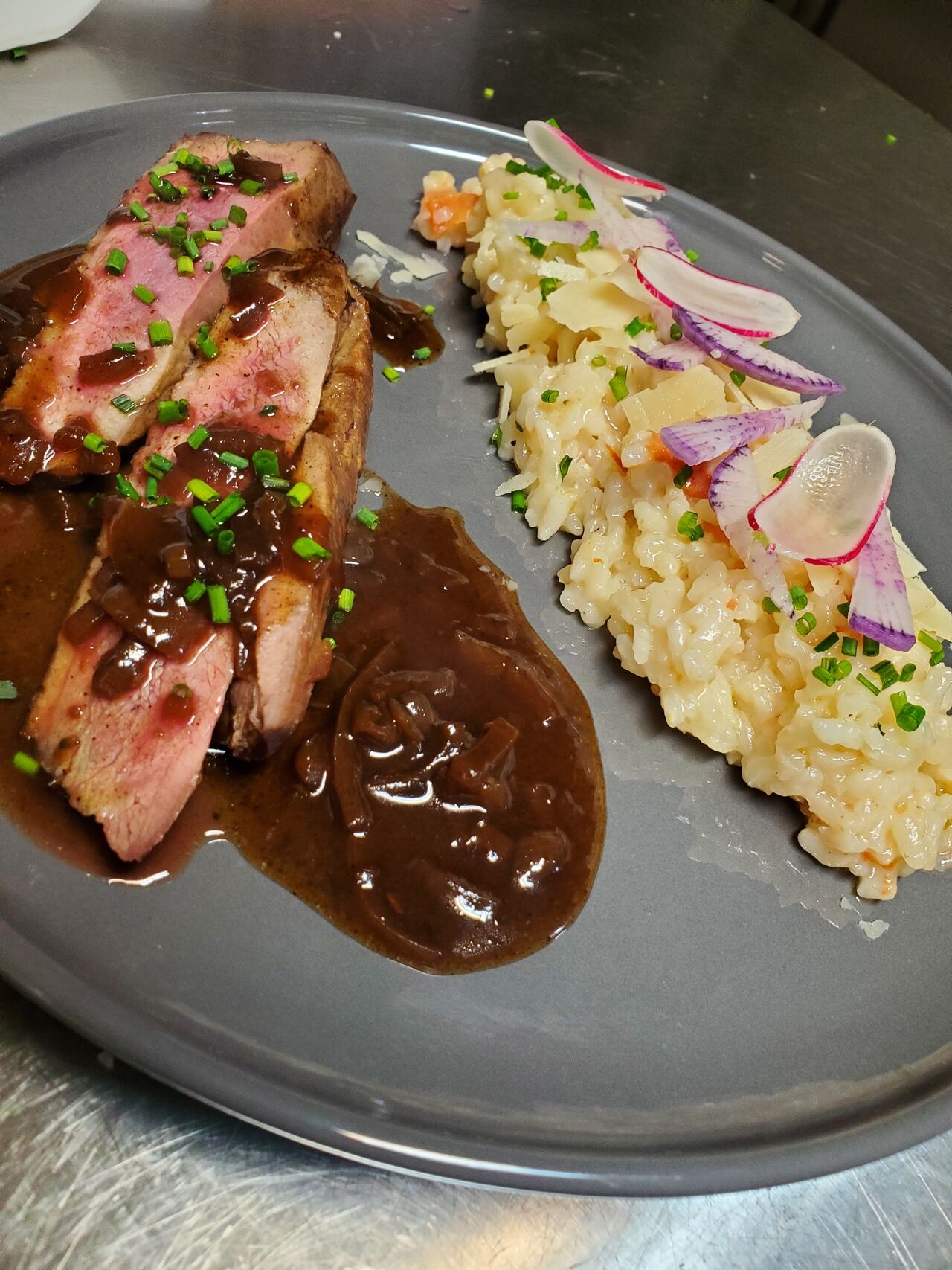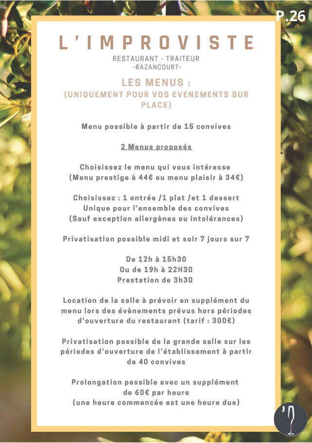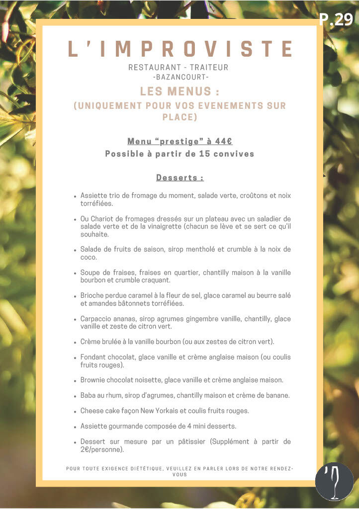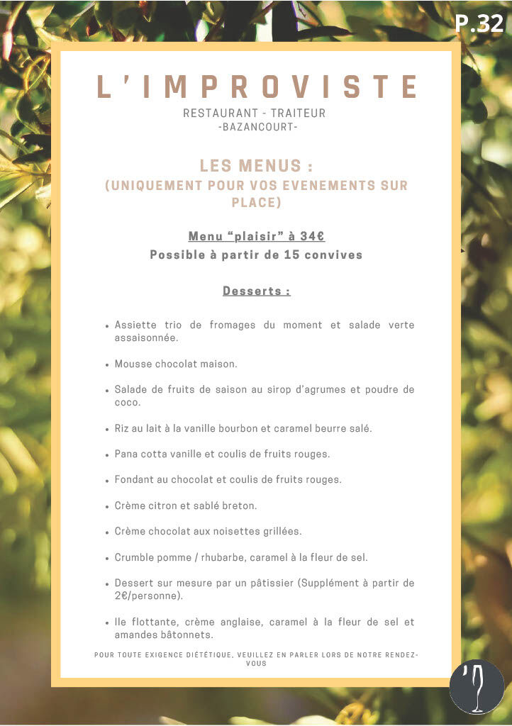 À Bazancourt, petite ville située au nord-est de Reims, l’Improviste accueille le gourmet dans un lieu spacieux à l’élégance contemporaine. À l’ardoise, la carte décline les propositions de la semaine : des suggestions authentiques et renouvelées au gré des saisons avec trois entrées, cinq plats, trois desserts et le fameux café gourmand. Le Chef, Vincent Klimek, travaille avec virtuosité une cuisine maison aux produits frais en privilégiant les producteurs de la région. Pour le déjeuner, la clientèle se restaure avec une viande cuite à la perfection ou des pâtes fraîches maison à la crème d’asperges blanches. Le soir, on prend le temps pour la dégustation que ce soit entre amis, à deux, en famille, lors d’une soirée réservée ou à l’improviste !