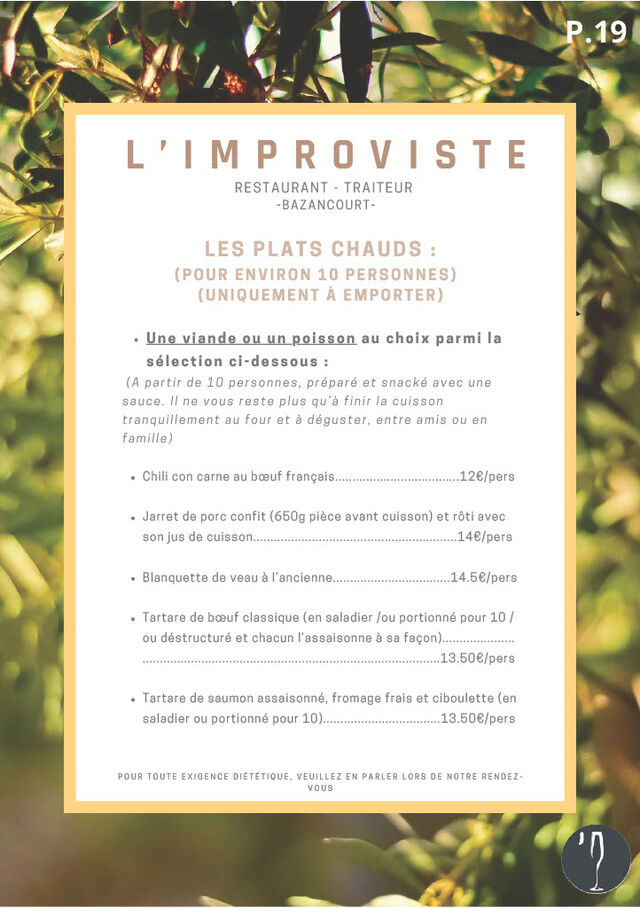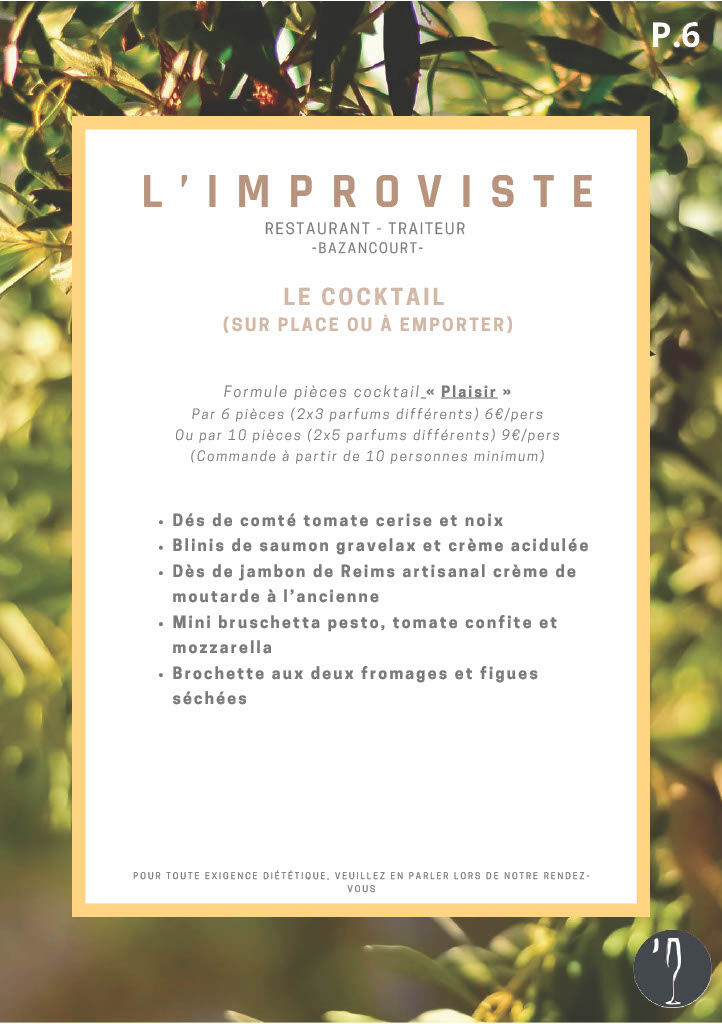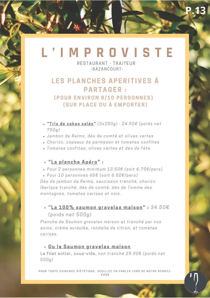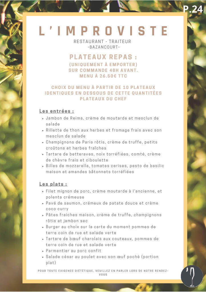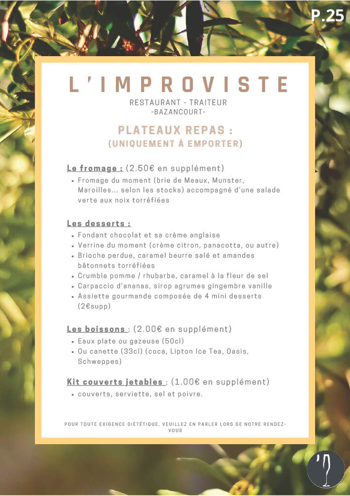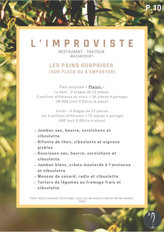 A l'Improviste vous pouvez aussi commander à emporter le Burger et la Pâte du moment sur les heures des services. N'hésitez pas à nous contacter.